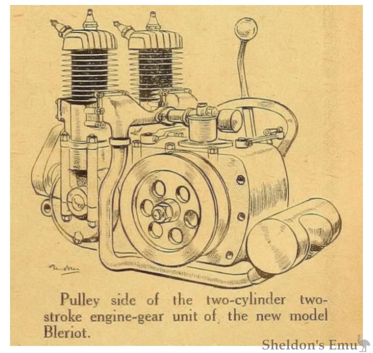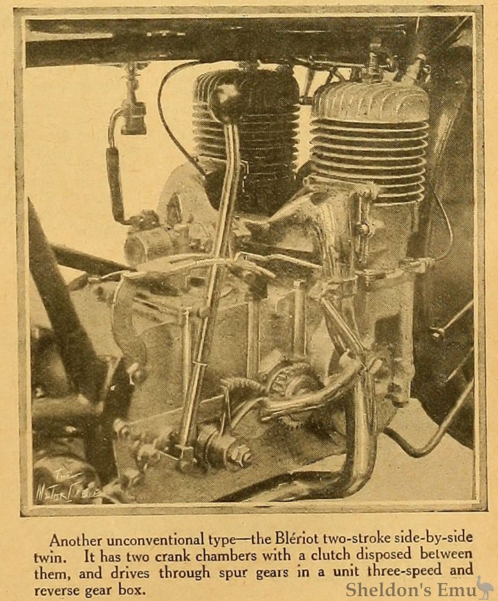 Side-by-side twin engines are favoured by the Bleriot Company, for, in addition to the four-stroke two-cylinder model now established on the French market, a twin two-stroke of 750 c.c. capacity is introduced this year finished, in fact, a few days before the Salon opened. Like the four-stroke model, the gear box forms part of the crank case, the clutch is located between the two crank chambers, and there are three speeds and reverse, the latter, perhaps, more by accident than intention, since the power unit was designed for and is fitted in the new French Bleriot cycle car. The machine presents quite a good appearance, but there is still a certain amount of experimenting to be done before the model will be offered to the public, such points as economy and silence not yet having had very close attention.
