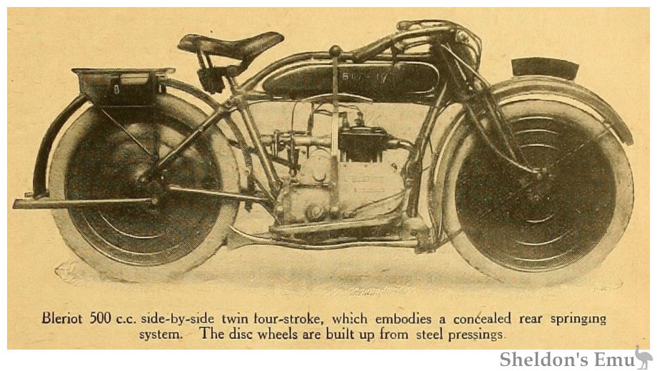 Bleriot 500 c.c. side-by-side twin four-stroke, which embodies a concealed rear springing system. The disc wheels are built up from steel pressings.