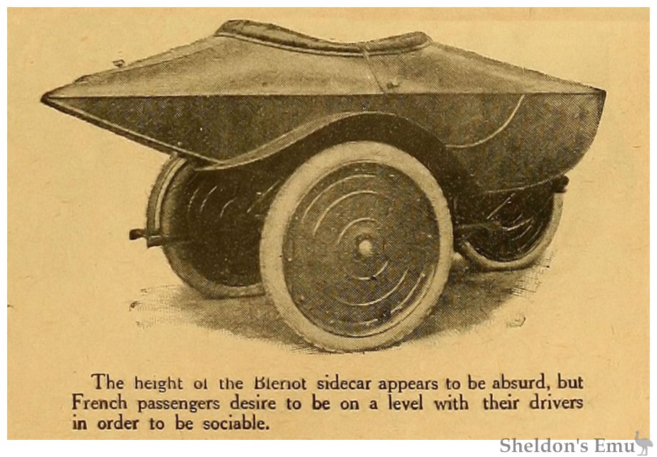 The height of the Bleriot sidecar appears to be absurd, but French passengers desire to be on a level with their drivers in order to be sociable. Bleriot