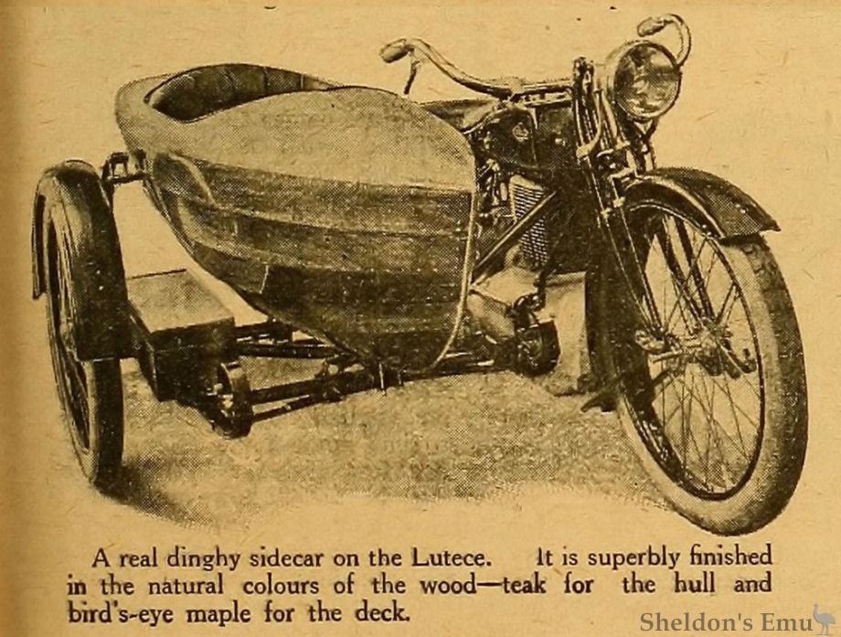 The Lutece is unconventional in another direction, and conforms more to accepted motor cycle practice plus certain features borrowed from the car. It has a vertical twin engine with gear box integral with the crank case, and the final drive is by shaft. Like the Janoir, it is sprung at the rear on leaf springs, but no torque rods are fitted, and stays, pivoted at the rear of the saddle, are intended to ensure lateral rigidity.