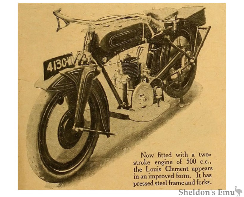 Now fitted with a two-stroke engine of 500 c.c, the Louis Clement appears in an improved form. It has pressed steel frame and forks.