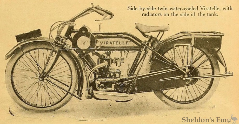 The last machine in this group is the Viratelle, which was seen outside Olympia last November. It has a water-cooled side-by-side four-stroke twin engine, placed across the frame, with integral gear box, the final drive being by chain. Two circular radiators are located at the fore end of the tank. A single-cylinder model on similar lines is also exhibited.