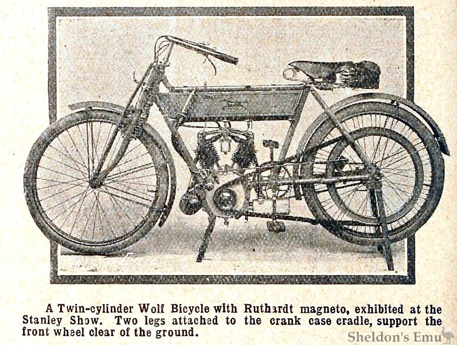 The company introduced a light motor bicycle at last year's Show, and it has been so successful that they have developed it in several respects, and now show quite a large number of different models. The Wolf, the Royal, and the Superb, are all made in two styles - (A) with accumulator and coil ignition, (B) with magneto ignition, and all these machines have the same engine, though arranged somewhat differently in each. It will be remembered that the motor is very light, and is constructed with an outside flywheel...