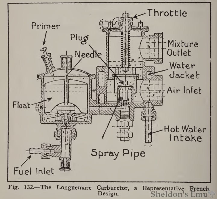 The form shown is provided with a heating jacket and when used, in connection with an air-cooled motor, a portion of the exhaust gas is usually deflected through this chamber to furnish heat. It is not customary to provide these heating chambers on motorcycle carburetors.