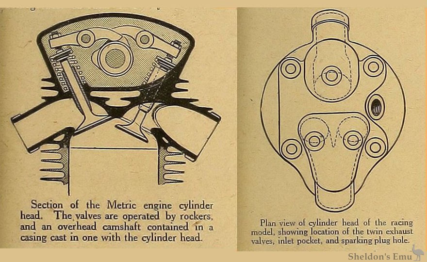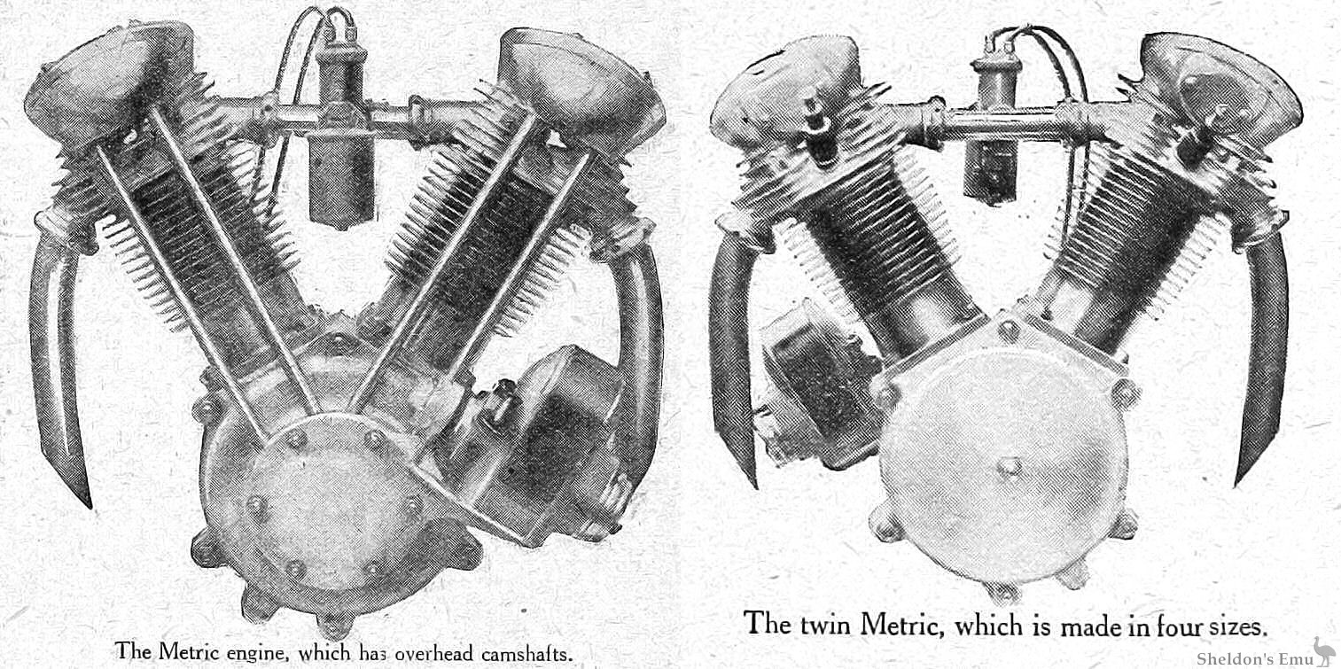 After the Great War, aeronautical designs began to influence the design of motorcycle engines. In late 1919 the newly created Metric Co. London featured a range of eight engines with overhead camshafts and other advanced features.
