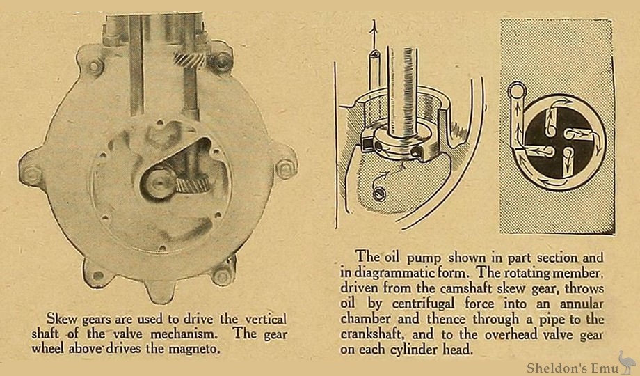 Skew gears are used to drive the vertical shaft of the valve mechanism. The gear wheel above drives the magneto.