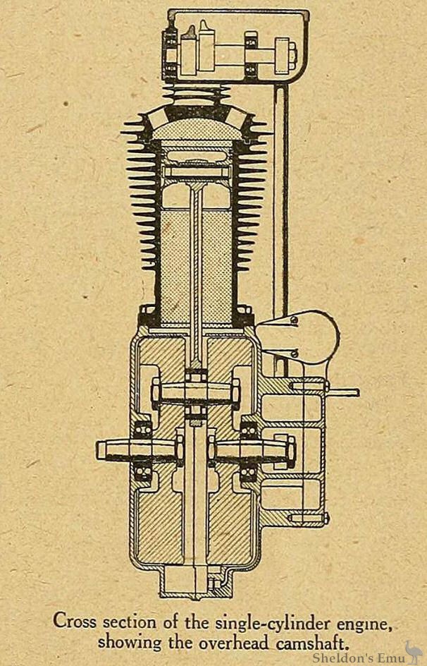 Cross section of the single-cylinder engine, showing the overhead camshaft.