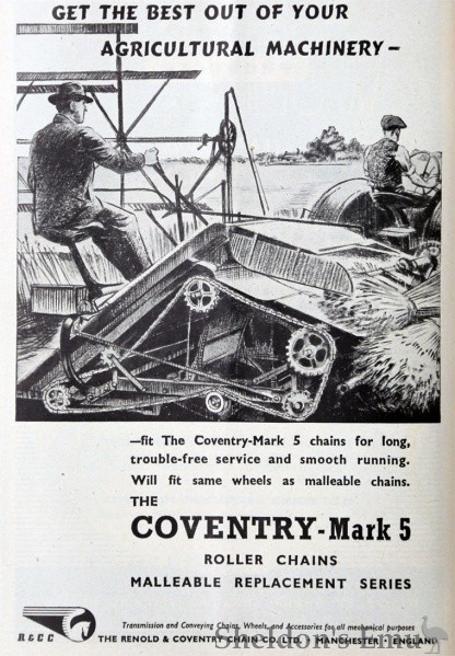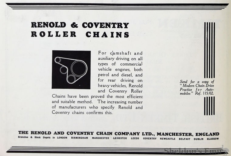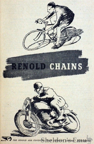 Hans Renold, of Manchester; a complete line of motorcycle chains from 3.16 inch wide upwards, and motorcar chains up to 2½ inches wide.