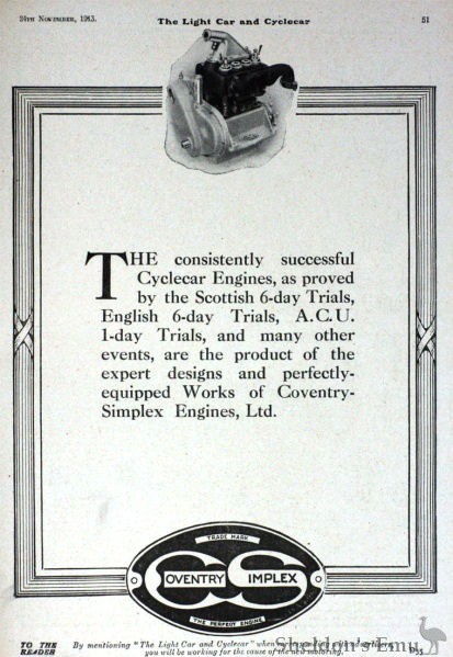 THE consistently successful Cyclecar Engines, as proved by the Scottish 6-day Trials, English 6-day Trials, A.C U. 1-day Trials, and many other events, are the product of the expert designs and perfectly-equipped Works of Coventry-Simplex Engines, Ltd.