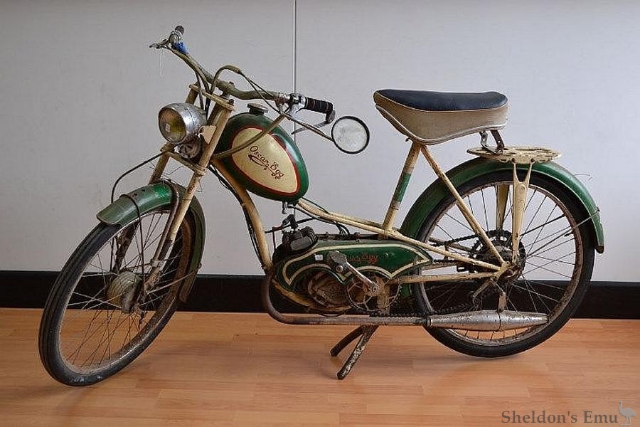 Colin Vickers of Vickers & Hoad in Sydney is responsible for a gem. Oscar Egg is a name which would bring naught but a puzzled look to most in the motorcycle world, but in cycling it's a very different matter. A world-record beater before the first war, he was still churning out masterpieces of velocipedary well after the second. An exceedingly rare moped bearing his name attracted considerable attention.