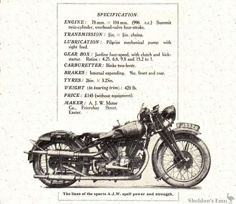 The A.J.W. range is very imposing, and is a real he-man's mount. Machines are produced with J.A.P. or Summit engines. The latter are perhaps better known as the famous Anzani or Vulpine engine. The £170 model with double-port twin Summit is perhaps the most majestic machine produced, and its performance is not belied by its appearance.
