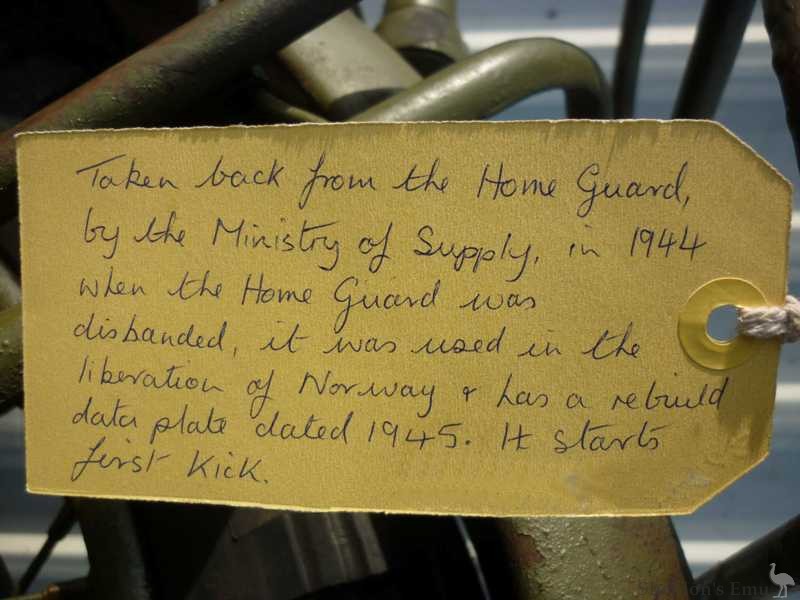 Taken back from the Home Guard by the Ministry of Supply, in 1944 when the Home Guard was disbanded, it was used in the liberation of Norway and has a rebuild data plate dated 1945. It starts first kick.