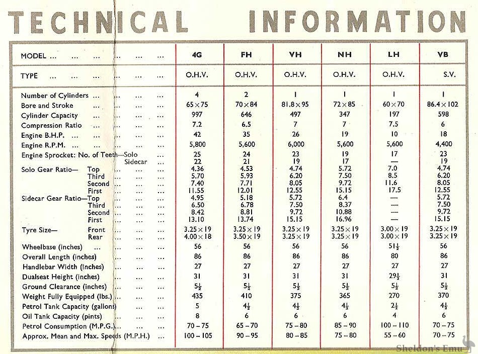 Ariel 1958 Specifications FH, VH, NH, VB