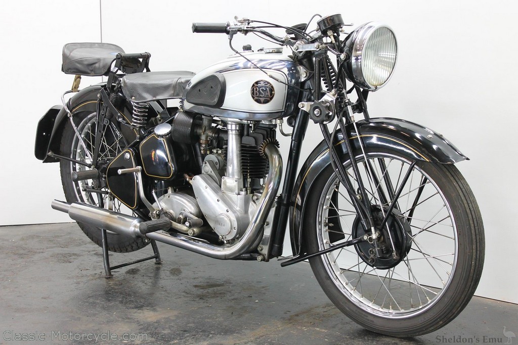 BSA's 500 heavyweight class was divided into three groups; the M22 was the 'cooking version'; the M23 Silver Star was the sports machine with a specially-tuned engine having a higher output than the M22; and the M24 Gold Star which was really a street-legal race bike. Val Page included several innovative and modern features in these new machines. The forged steel backbone of the previous models was replaced by a brazed steel tubular frame with a single backbone. The sump in the crankcase was discontinued in favour of a separate oil tank, and the mag-dyno was moved to the rear of the cylinder and driven by a chain from the right side. The engine has an air-hardened cylinder, a high-compression piston and 'hotter' cams. A major advance was full enclosure of the valve gear.