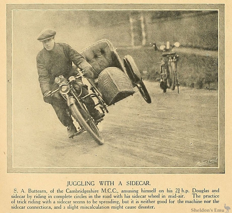 S. A. Buttearn, of the Cambridgeshire M.C.C., amusing himself on his 2 3/4 h.p. Douglas and sidecar by riding in complete circles in the road with his sidecar wheel in mid-air. The practice of trick riding with a sidecar seems to be spreading, but it is neither good for the machine nor the sidecar connections, and a slight miscalculation might cause disaster.