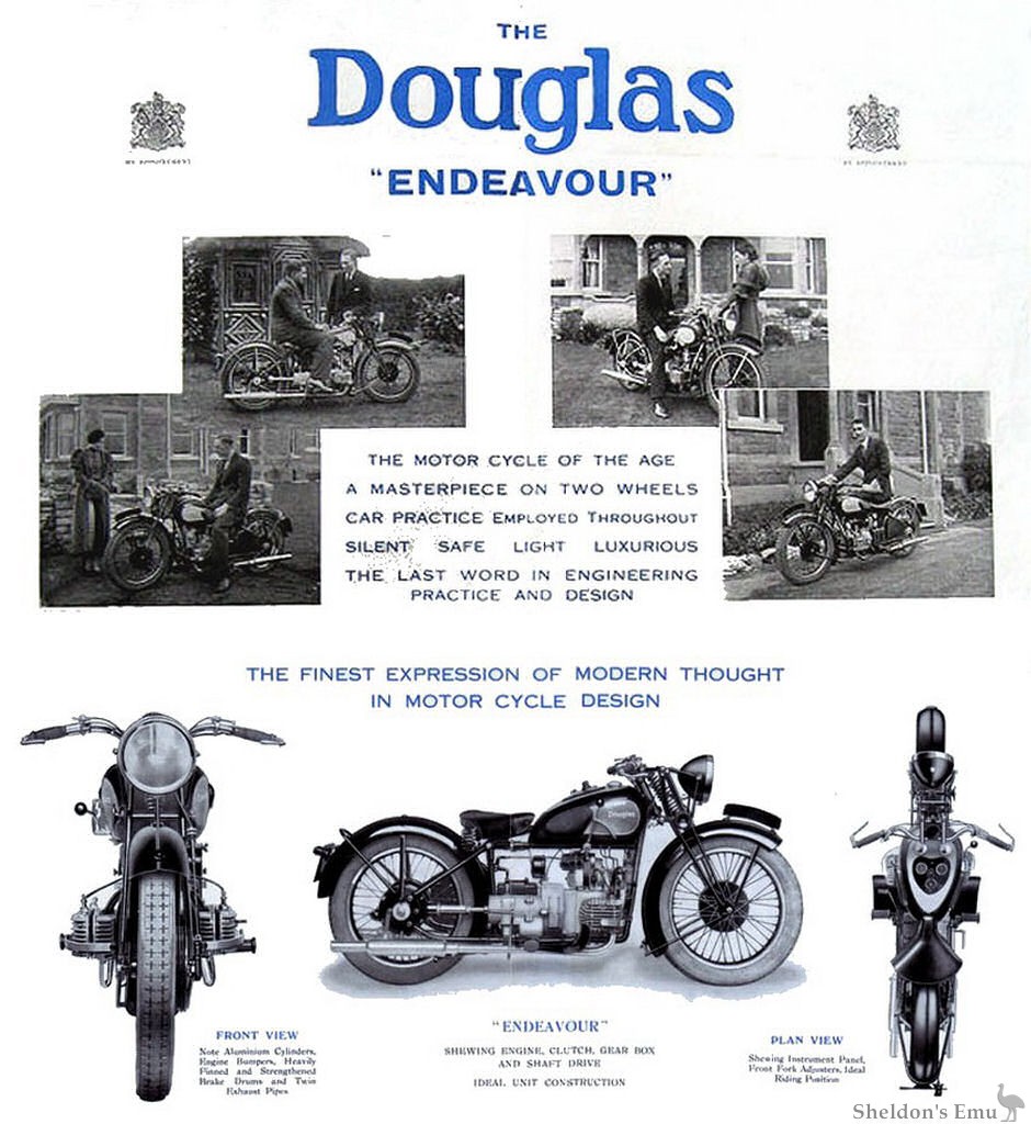 Featured on the Douglas stand at the 1934 Olympia Show, the Endeavour was the first Douglas transverse HO twin. Designed by Eddie Withers and Jack Clapham, it used a side-valve engine, cardan shaft and a four-speed gearbox, retaining hand-controlled gear change. It did not appear in the 1935 catalogue. It is believed that only 200 were built (though opinions vary on the actual figure), and the list price was a high £72-10-0. Sales were slow, and they were remaindered by Pride and Clarke for 49 pounds ten. Even that was expensive compared to 1936 when Pride & Clarke advertised the standard configuration 600cc SV for a mere £32.