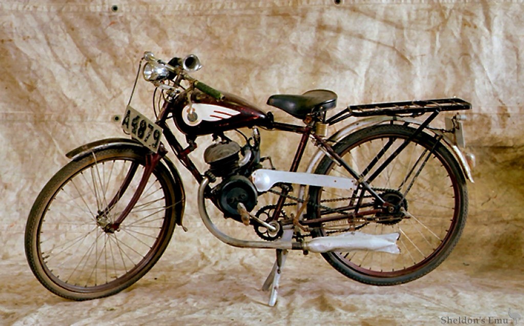 ILO FM 100-motor tillverkad av ILO Motorenwerk GmbH, Pinneberg, Tyskland. Tysk Graetzin förgasare, svänghjulsmagnet. Denna har fått en större tank än ursprungliga, från efterföljaren modell 22 från 1939, "Änglavingen", efter bensintankens dekor. Motornummer 123481. Registreringsnummer A4879. ILO encylindrig tvåtaktsmotor, cylindervolym 98 cc Cylinderdiameter 50 mm Slaglängd 50 mm 2,6 hk vid cirka 3 200 varv/minut Två växlar och kedjedrivning Däckdimension: Trådkantsdäck 26x2x1.