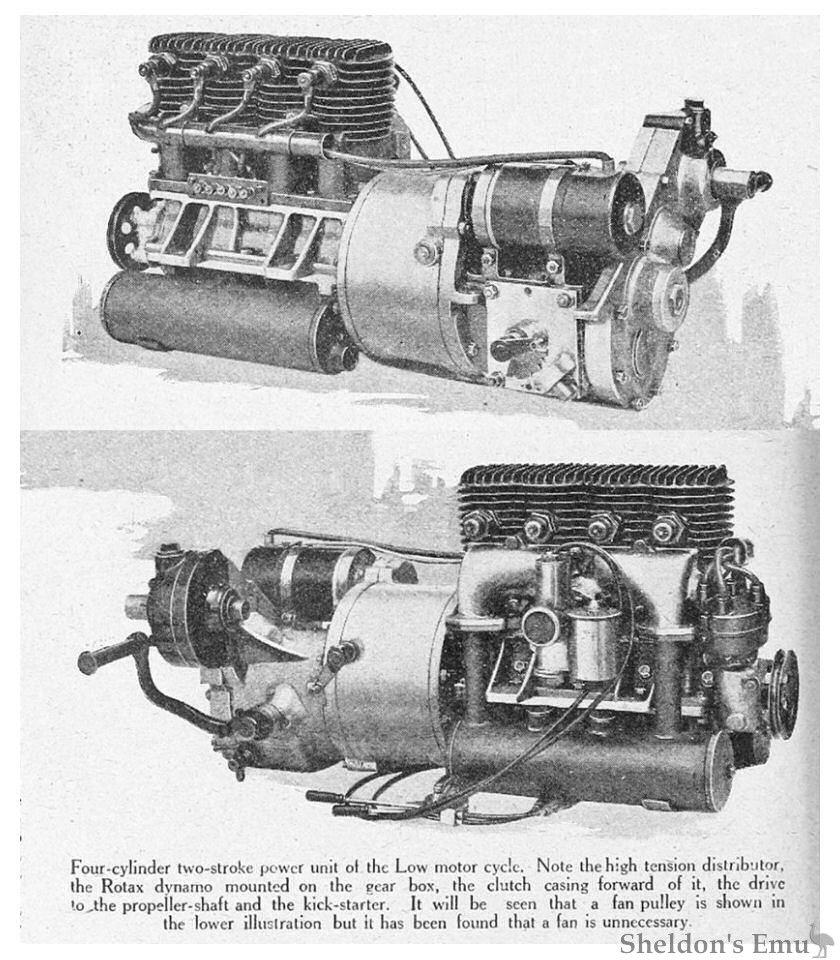 Four-cylinder two-stroke power unit of the Low motor cycle. Note the high tension distributor, the Rotax dynamo mounted on the gear