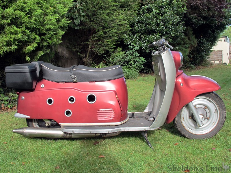 Another of the continent's traditional motorcycle manufacturers of quality machinery in the early fifties who saw it's future in supplying the scooter market was the West German Maico (pron.'' MY- co'') concern. They were not far out as the Maicoletta scooter models eventually outsold their road motorcycles. One of the largest and most advanced scooters on the market at the time it had 250 and 277cc (side car model) piston port 2 stroke fan cooled engines, enclosed chain drive, electric start and 4 speed foot operated gearchange.