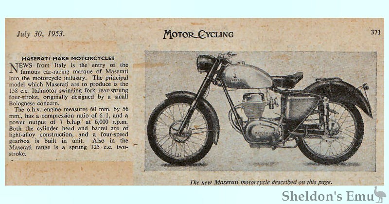 News from Italy is the entry of the famous car-racing marque of Maserati into the motorcycle industry. The principal model which Maserati are to produce is the 158cc...