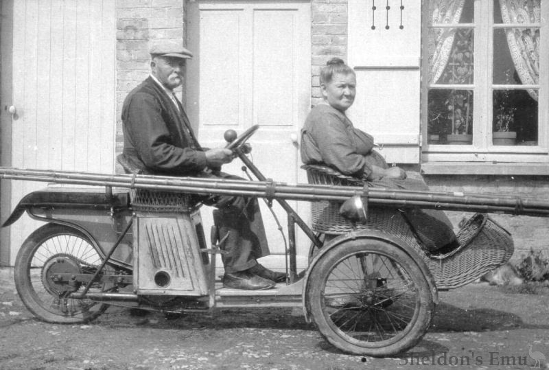 Period photo of a man and a woman on a tandem tricycle with wicker chair.