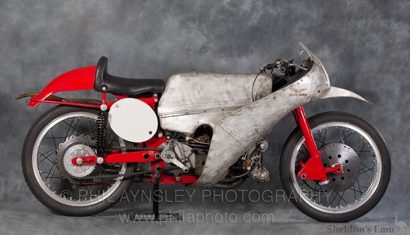 The 1953 Guzzi 250 Bialbero (translation: DOHC) owes its unusual shape to testing performed in the wind tunnel which the factory had installed the previous year and was instrumental in providing their machines with a strong aerodynamic advantage. Bearing in mind that the men who founded the company were WWI pilots, the link with aviation becomes clear. ~ MXN.