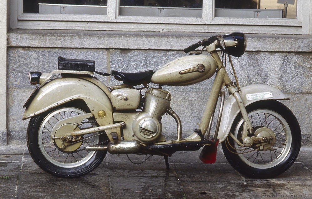 The Falchetto-designed Delfino was introduced in 1952, derived from the successful 1948 Motom 48S. The project was personally overseen by Frua Ernesto De Angelis, a primary Motom shareholder. This scooter-like motorcycle, however, did not achieve the excellent market results of the previous model.