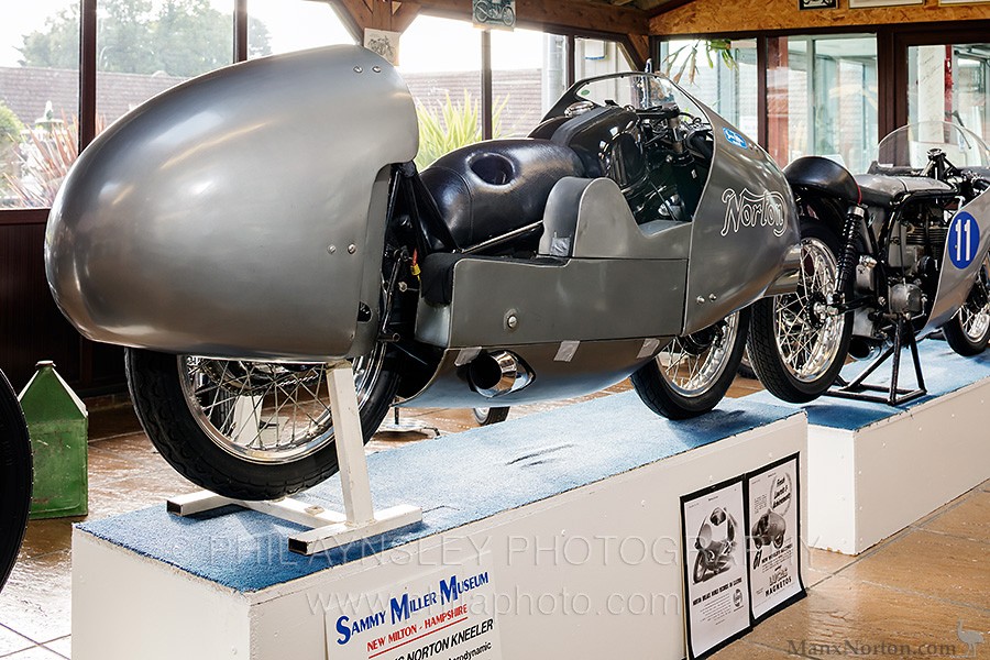 Phil Aynsley writes, "In an effort to improve their already successful Manx, the factory debuted this radical design at the North-West 200 in 1953. The motor was suspended between duplex top tubes with the fuel and oil carried low down. Rider Ray Amm set a 350cc class record before the motor overheated causing his retirement. The combination of a low centre of gravity and superb aerodynamics provided excellent handling and a high top speed. Indeed Amm set 22 world records at the Montlhery track (near Paris) in November, including one lap at 234kph."