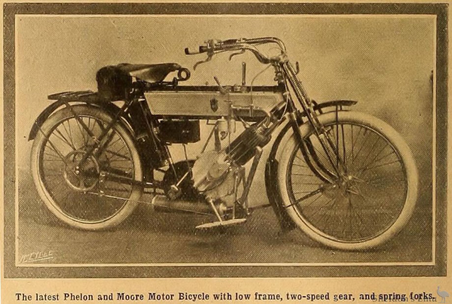 The latest Phelon and Moore Motor Bicycle with low frame, two-speed gear, and spring forks.