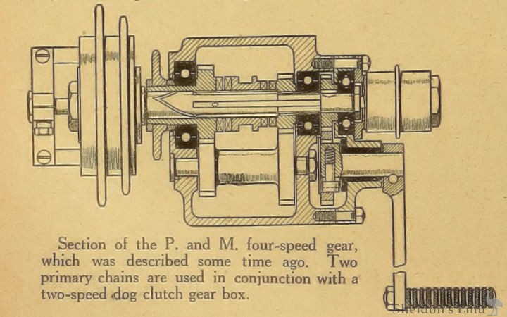 Section of the P. and M. four-speed gear, which was described some time ago. Two primary chains are used in conjunction with a two-speed dog clutch gear box.