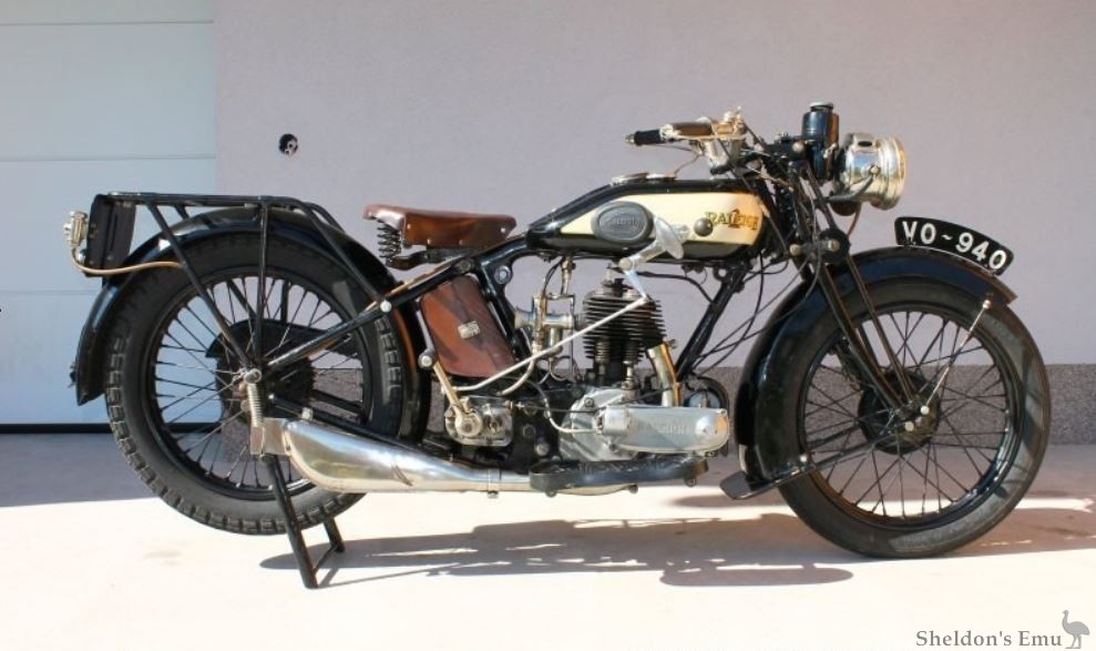 In the late 1920s Raleigh produced motorcycles from 174cc to 498cc sv and 348cc to 498cc ohv. The engine of this model has a displacement of 496cc developing 10.5 hp. Bore diameter is 79mm and stroke 101mm. The machine is equipped with a Sturmey Archer 3-speed transmission and acetylene lighting.