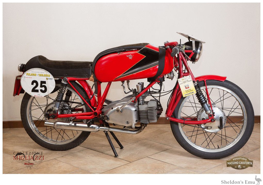 A new triangulated open cradle frame was created using lightweight tubing of different diameters, and fitted with swingarm rear suspension and Earles front forks. Styled by Donnino Rumi, the 18 litre tank is thing of beauty, modestly hidden by the tank's chest padding (a standard feature for this model). Submitted at the Turin Show and the trade fair in Milan in the spring of 1955, the Junior stood out from the score or more of two-stroke singles displayed by well-known manufacturers including Benelli, Parilla, Motobi and Maserati.