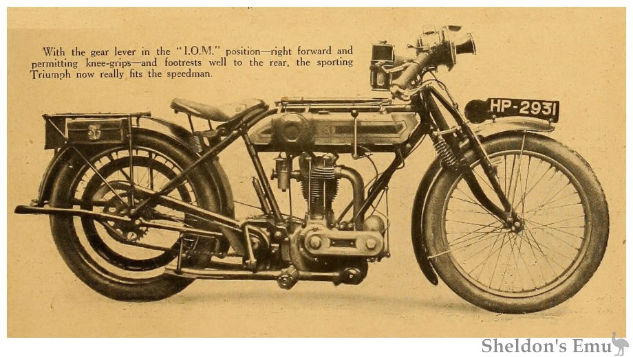 With the gear lever in the "I.O.M." position - right forward and permitting knee-grips - and footrests well to the rear, the sporting Triumph now really fits the speedman.