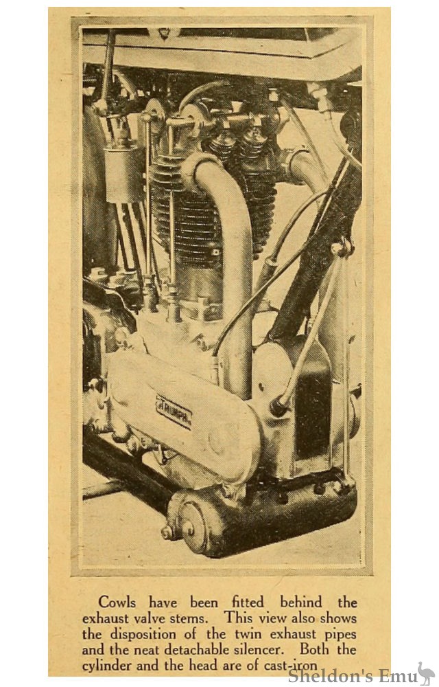 Cowls have been fitted behind the exhaust valve stems. This view also shows the disposition of the twin exhaust pipes and the neat detachable silencer. Both the cylinder and the head are of cast-iron