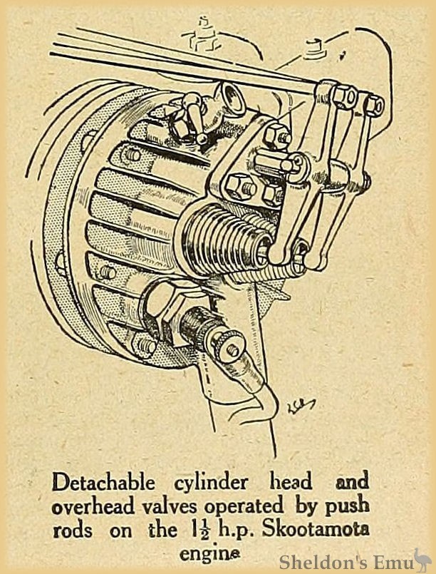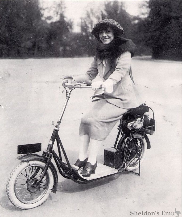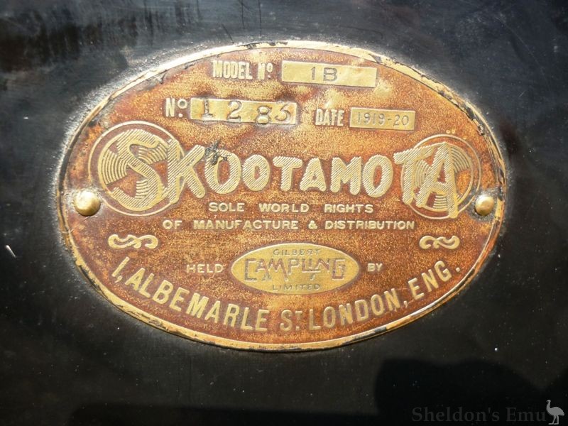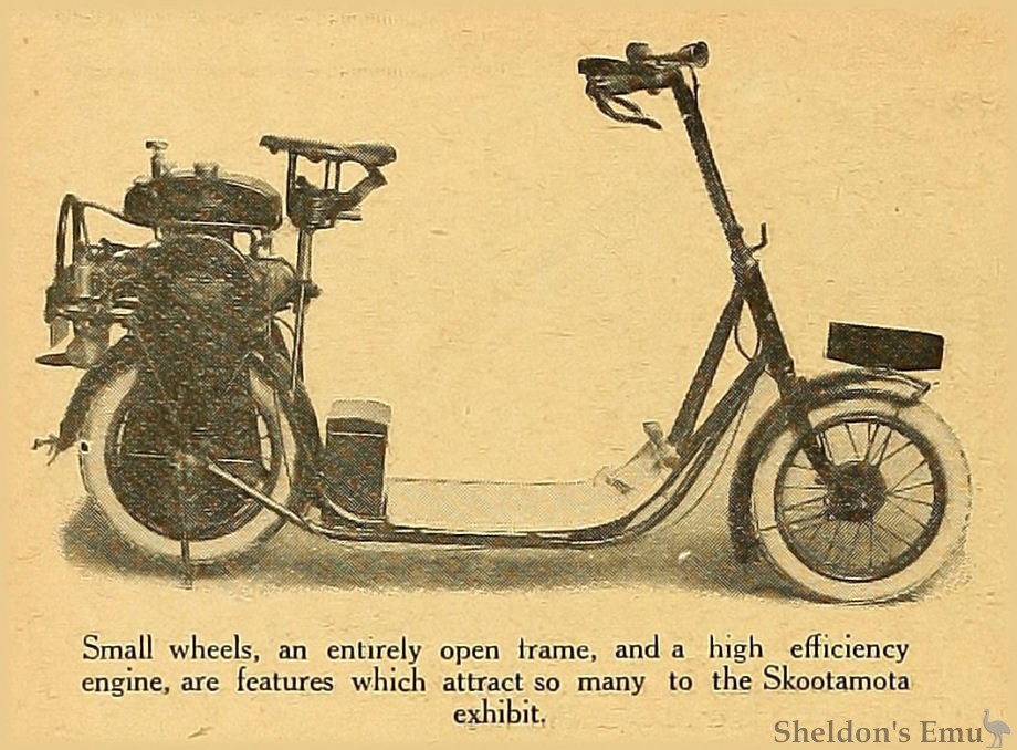 1920 The Skootamota had a design change, to a single cylinder 123cc OHV engine by ABC, also a Bradshaw design, and transmission by chain to the rear wheel. The fuel tank was positioned over the engine and the saddle to the front so that the rider could sit when in motion.