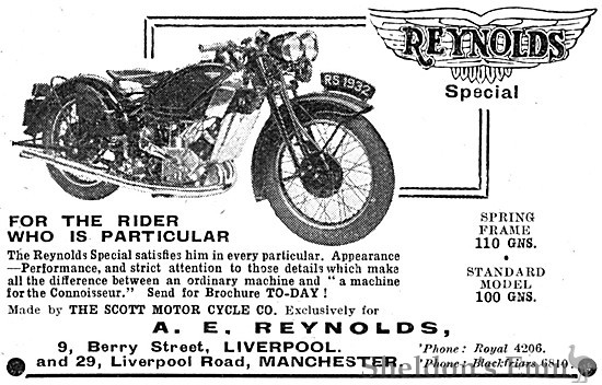 1931 Albert Reynolds was a Scott dealer who produced parts for the marque, and that year the factory began supplying him with models to his own specification.[1] To begin with they were known as Aero Specials, from his initials. Engines of both 497cc and 598cc were listed along with Brampton forks, Velocette-type foot-change and twin headlamps.