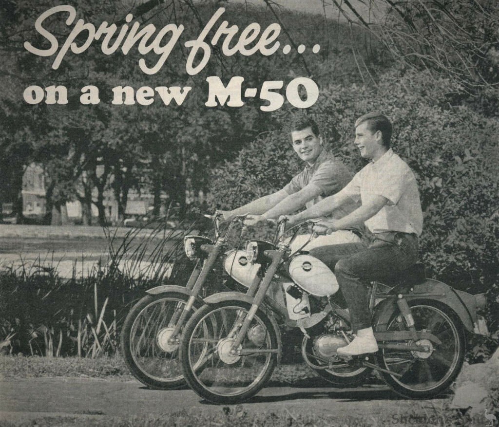 Harley-Davidson promoted the affordability and easy-riding characteristics of the 1965 Model M-50. Its 50cc two-stroke engine developed 2.5 horsepower. The three-speed, Cascade-type, hand-shifted transmission was cable-controlled from the right handgrip. Assembled in the Aermacchi-Harley-Davidson factory in Lake Varese in Varese, Italy, this was the company's smallest motorcycle to date. The M-50 weighed 103 pounds, had a 1.6 gallon gas tank, and returned 45 miles per gallon. This example, in Holiday Red and White, sold for $225 new. Aermacchi-Harley-Davidson manufactured about 9,000 of these in 1965.