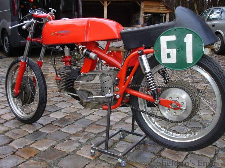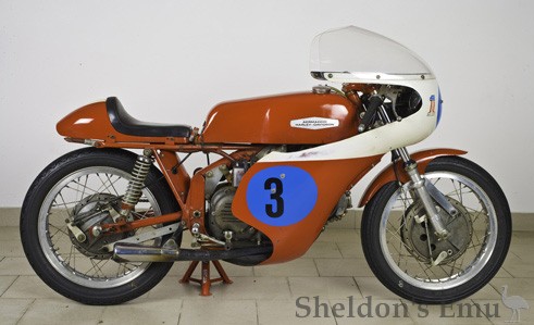 The Aletta Turismo 125 was the basis for the 125cc Ala d'Oro. The development of this model began in 1966 and the first prototype raced in 1967 with a bore and stroke of 56x50mm, developing an extra 10 horsepower. In 1968 several refinements were made and in 1969 the first racers were manufactured. Some 207 machines were produced in total. Top speed of this model was 175 km/h. In later years replicas of the Ala d'Oro were built.