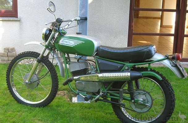 The original R/C 125 was a quite nicely styled, and in 1974 the AMF version appeared. The image of the later model does not show the original paint scheme - the new paint was green with horizontal lines across the fuel tank. Fuel tank and pillion seat were replaced and an incredible chain-protector was installed, a sort of half-moon. These changes were made apparently to make it look like a "Great American Freedom Machine".