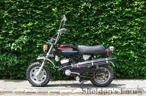 The "new" mini-bike X-90 is a 90cc 2-stroke 4-speed model. Looking back at 1972 clarifies the "new" in all this... the MC-65 (Shortster) of the Aermacchi-Harley-Davidson era was clearly the basis of the X-90. Wheels, front susspension, mudguards etc are identical to the Shortster and also the frame is very similar to the MC-65. The new engine comes with a seperate oil tank - no more pre-mix. AMF-Harley-Davidson was very clear about the use they aimed for in their promotions: leisure. Production was from 1973 to 1974 with probably some manufactured in 1975. Total number manufactured: 16,837. They sold new in the Netherlands in 1973 for f 1.595,- and in 1976 (more than one year old) for 1.995,-