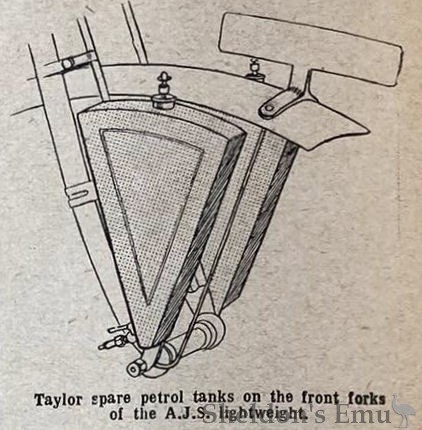 A particularly neat fitment shown on one of the machines on this stand is a spare petrol carrier, supported on the front forks, and consisting of two V-shaped flat tanks on either side of the wheel; with a capacity of half a gallon.