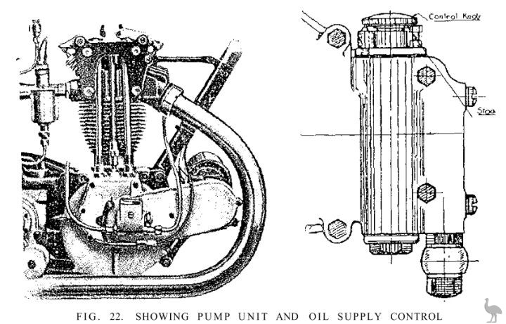 Engine Lubrication. All A.J.S. machines, except Big Twins and O.H.C.'s, now have adjustable mechanical lubrication, so that no attention whatsoever is required other than seeing that the oil level in the tank is kept at the correct level and occasionally draining the crankcase (see page 123). The amount of oil pumped to the engine can be varied by altering the setting of the control knob on the pump unit (Fig. 22). Screwing this knob down, i.e. in a clockwise direction, cuts down the supply of oil, while turning: it the reverse way increases the supply. As may be seen in Fig. 22, a stop below the control knob prevents the oil supply being cut right off When the engine leaves the factory the oil supply is set on the generous side, and after the engine has been well run-in, say after a mileage of 500 to 600, or if the engine smokes excessively, the control knob should be screwed, down about one-eighth of a turn and then re-tested for about 50 miles. If the oil supply is excessive, continue to cut it down by turning the control knob a further eighth of a turn, and so on, until the correct degree of lubrication is obtained. An approximately correct setting is arrived at by screwing the control knob lightly down to the stop and then unscrewing half a turn. If the lubrication system is functioning correctly, oil should be observed flowing from the small pipe inside the oil tank immediately below the filler cap.