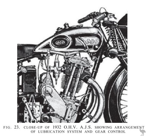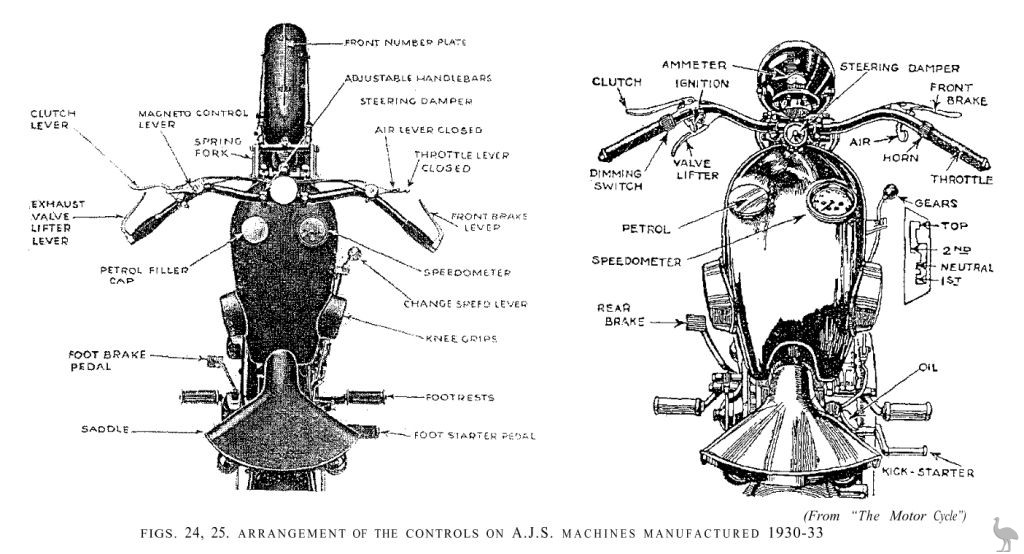 The A.J.S. Controls. The reader should not merely content himself with knowing how the various controls work, but he should understand their exact functions. He should also understand the four-stroke principle which is described in chapter V. He will then not drive the machine like a Robot, but like an intelligent being. It is a popular idea that motor-cycling requires little intelligence. This is not so; skillful driving requires deep concentration and thought. In fact, nearly all the faculties are brought into active play while driving a motor-cycle, and hence the satisfaction and pleasure that the motor-cyclist derives.