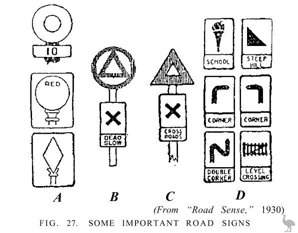 Danger Signs. There are various types of signs scattered about the country, and they should be implicitly obeyed. Fig. 27 shows the principal types. Those shown at A from top to bottom are respectively the local speed-limit sign, one indicating that road traffic is prohibited, and a general motor notice. At C and D are a group of self-explanatory signs. In spite of the abolition of the general speed limit, some local limits still exist and must be strictly observed. A special sign designed to show when a driver is approaching a main road from a subsidiary road is now in common use. This sign is shown at B (Fig. 27).