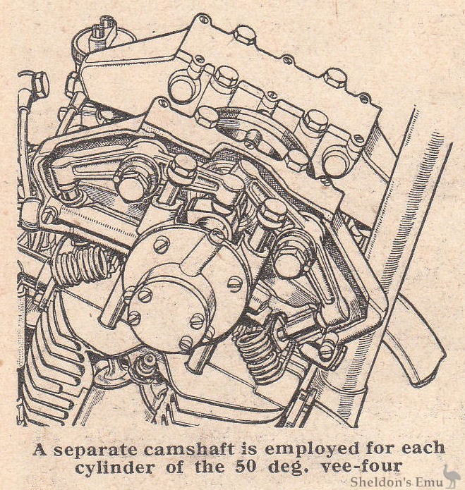 A separate camshaft is employed for each cylinder of the 50 deg. vee-four