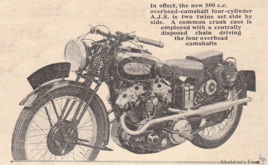 In effect, the new 500 c.c. overhead-camshaft four-cylinder A.J.S. is two twins set side by side. A common crank case is employed with a centrally disposed chain driving the four overhead camshafts.