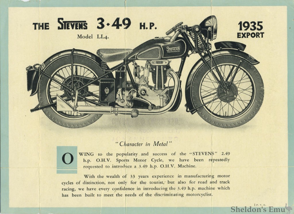 The Brothers Stevens have been designing and manufacturing motor cycles of distinction since 1902. Motor cycles of their make have won literally thousands of awards - over 100 World's Records in one year, and including the coveted Tourist Trophy on seven occasions.