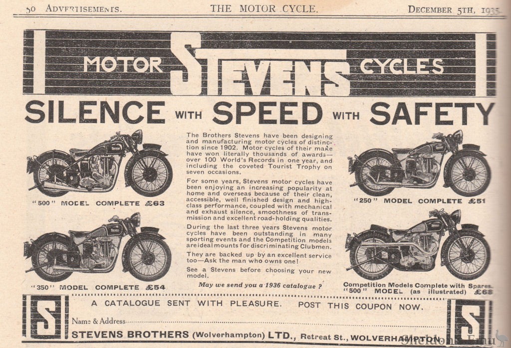 For some years, Stevens motor cycles have been enjoying an increasing popularity at home and overseas because of their clean, accessible, well finished design and high-class performance, coupled with mechanical and exhaust silence, smoothness of transmission and excellent road holding qualities.