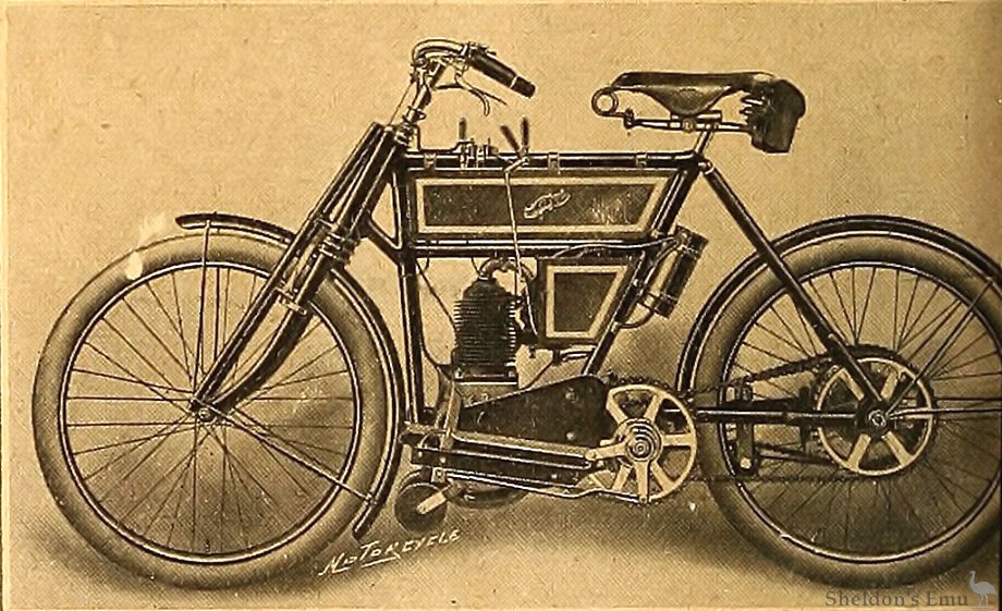 Owing to the presence of this two-speed gear no pedals are fitted; footboards, however, are provided, and on each footboard is a push forward pedal. That situated on the near side of the machine controls the clutch, while that placed on the off side works the gears. The arrangement is exceedingly simple and handy. The whole machine is carefully thought out, and means of adjustment are provided for all three chains. Powerful brakes are fitted. The ordinary rim brake is to be found on the front wheel, while the rear is internal expanding type. The machine is sold at a very low figure, and should appeal strongly to riders who favour a low-powered machine with change-speed chain transmission.