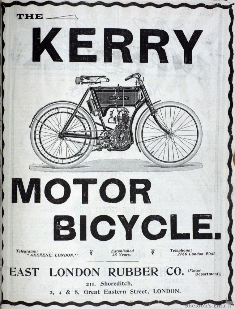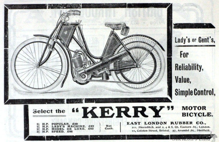 This firm's speciality at the Stanley Show will be Kerry motor bicycles in 2¼, 2¾, and 3½ h.p. A special point will be made of engine sets and motor cycle sets for agents, so that they may build machines themselves. The Kerry engine this year will be set vertical in a curved tube frame, but if preferred the engine sets and motor cycle sets can be supplied with the engine set into a loop frame.